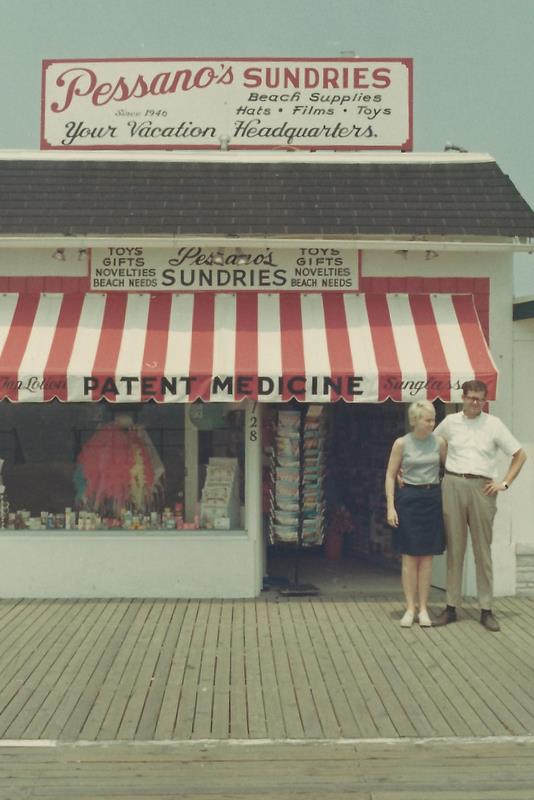 In 1964 the next generation of Pessano's at 3rd street began. After the retirement of William, David purchased the business and began what is now Pessano's Variety. David, who was not a pharmacist, took the corner store in a new direction. Gone were the soda fountain, prescription counter and Jane Logan ice cream case to be replaced with more beach related items, toys, novelties and convenience items. In 1966, after perfecting his craft at 3rd Street, David bought out MaryJane and Jim on the boardwalk and ran both stores until 1968 when he met and married his wife Jean Pessano(Allen). Now with a partner in life and business the Pessano brand began to flourish. David was now able to concentrate his time on the boardwalk operations while Jean took care of the 3rd street operations. This team was so successful that they added a 3rd location in 1969 in the 1300 block of the boardwalk.